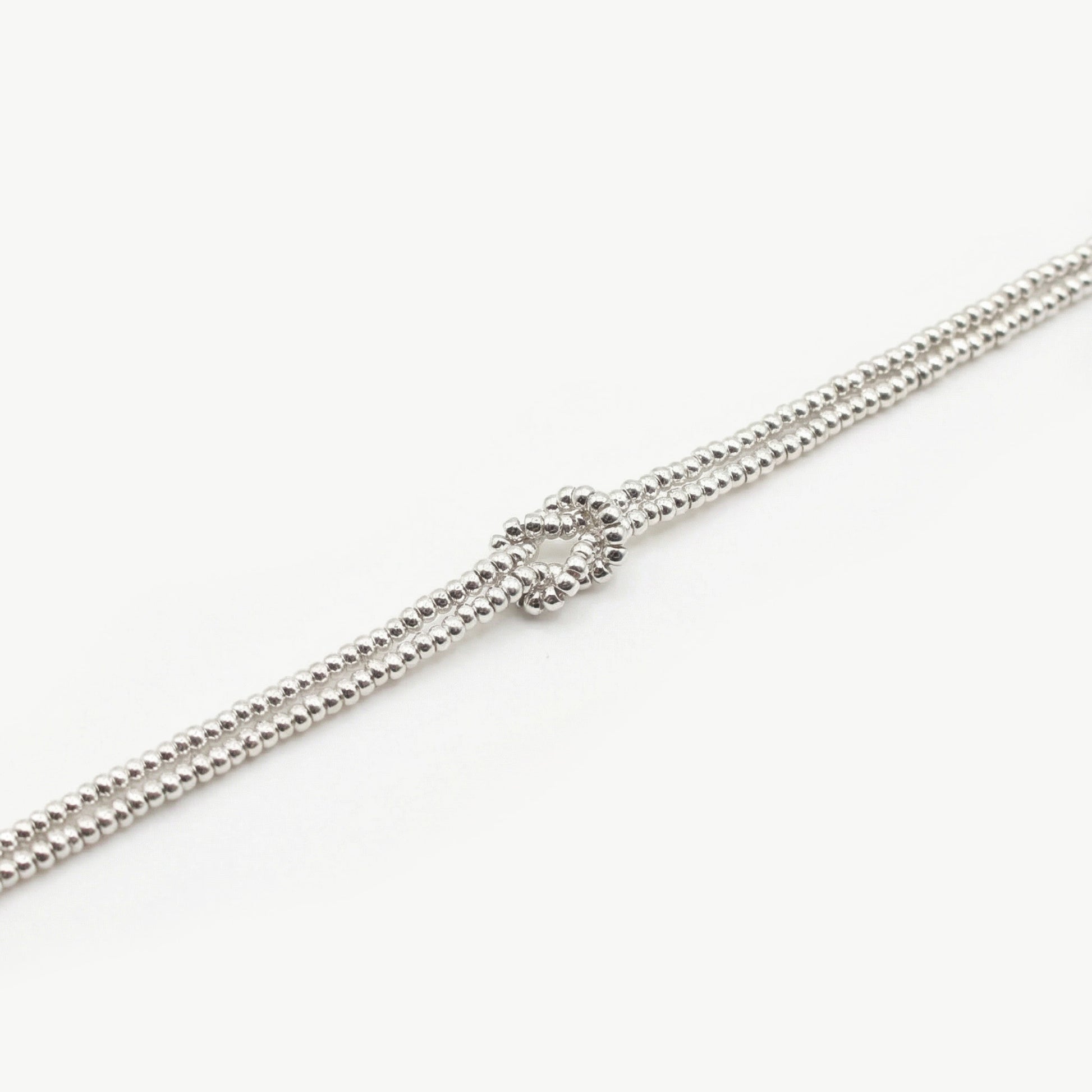 Questo bracciale nodo argento è realizzato a mano in Italia con perle in vetro di alta qualità. In taglia unica da 15 cm estendibili fino a 19 cm, con chiusura a gancio.