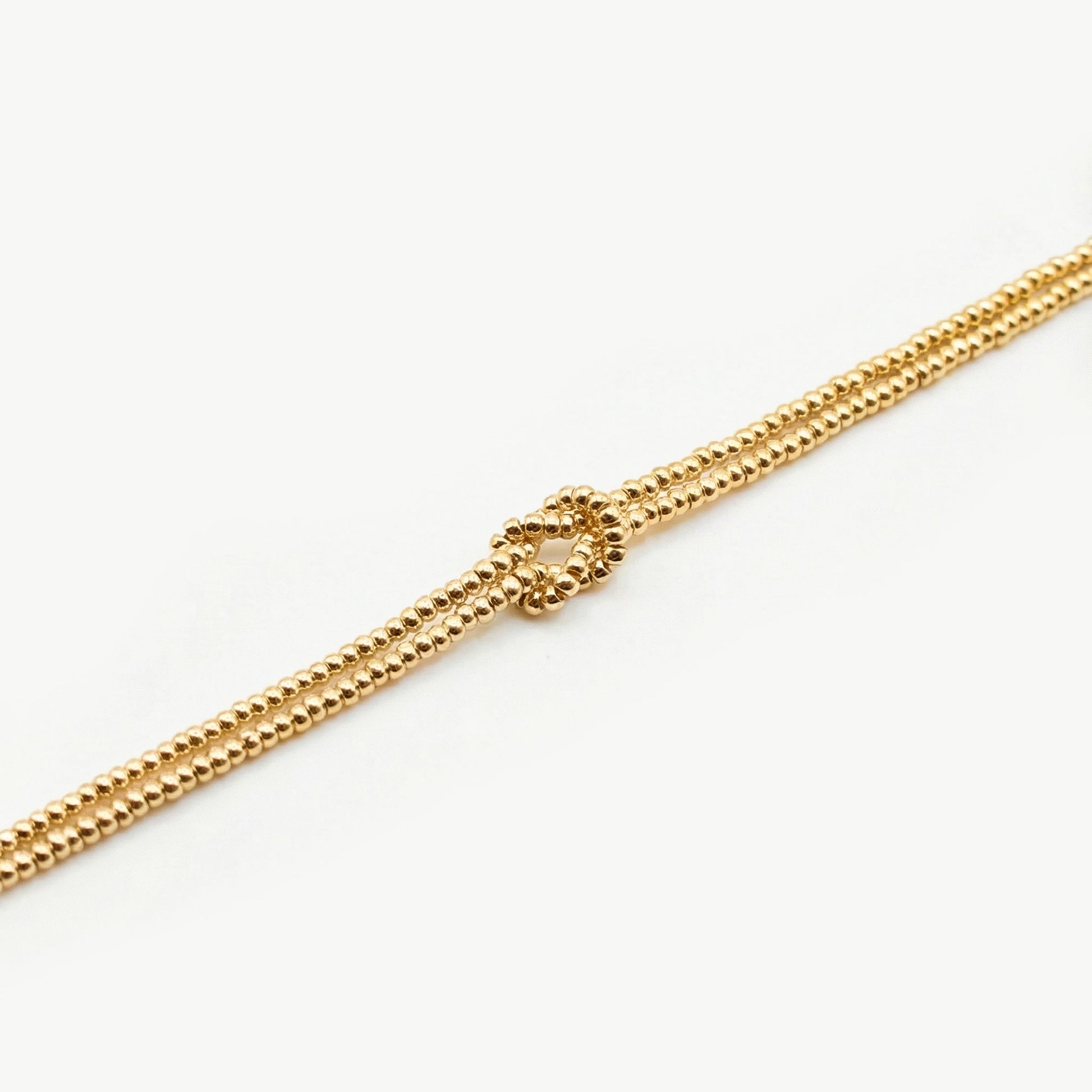 Questo bracciale nodo oro è realizzato a mano in Italia con perle in vetro di alta qualità. In taglia unica da 15 cm estendibili fino a 19 cm, con chiusura a gancio.