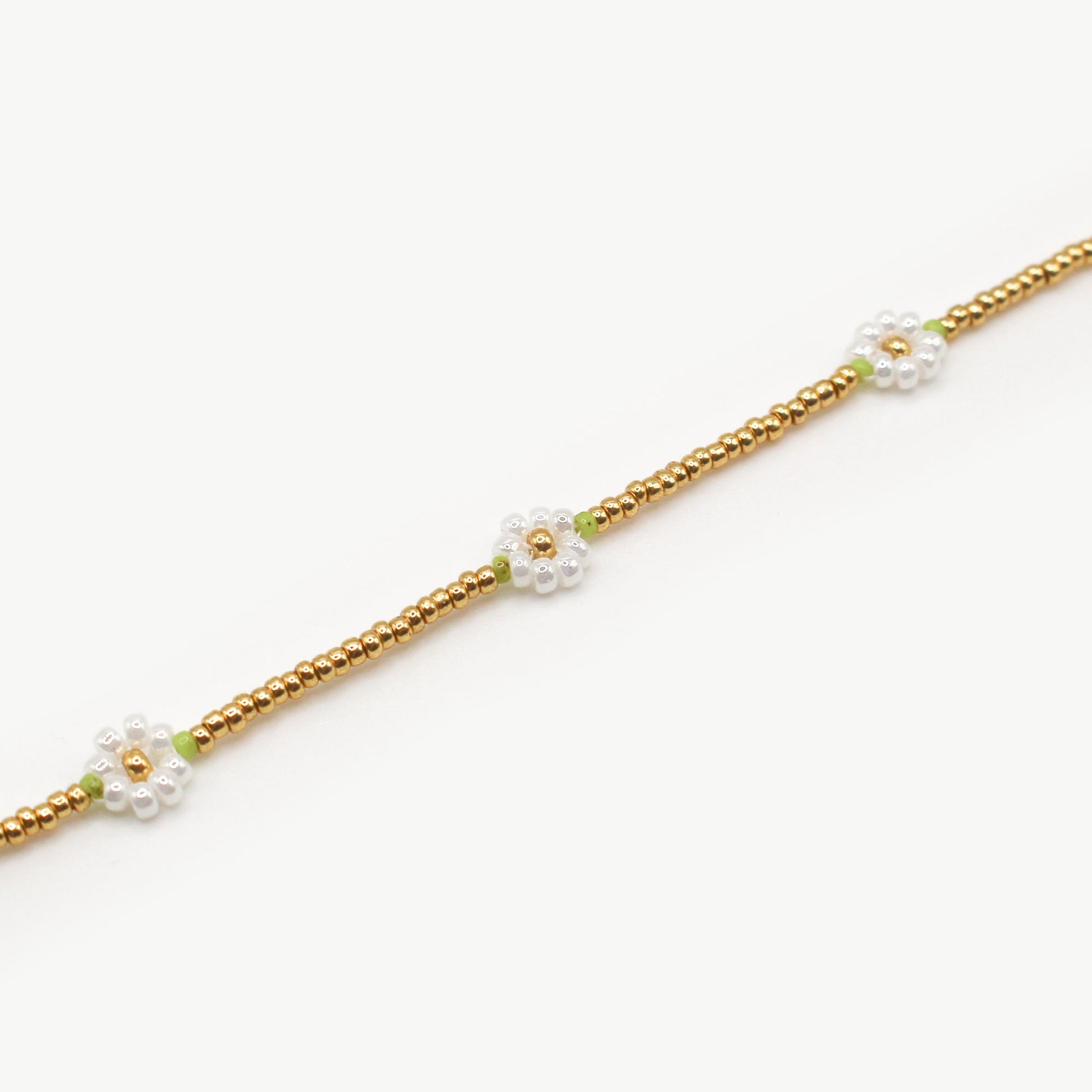 Questa collana con margherite, dorata con dettagli in verde, è realizzata a mano in Italia con oltre 400 perle in vetro di prima qualità e chiusura a gancio. In taglia unica da 42 cm estendibile fino a 45 cm.