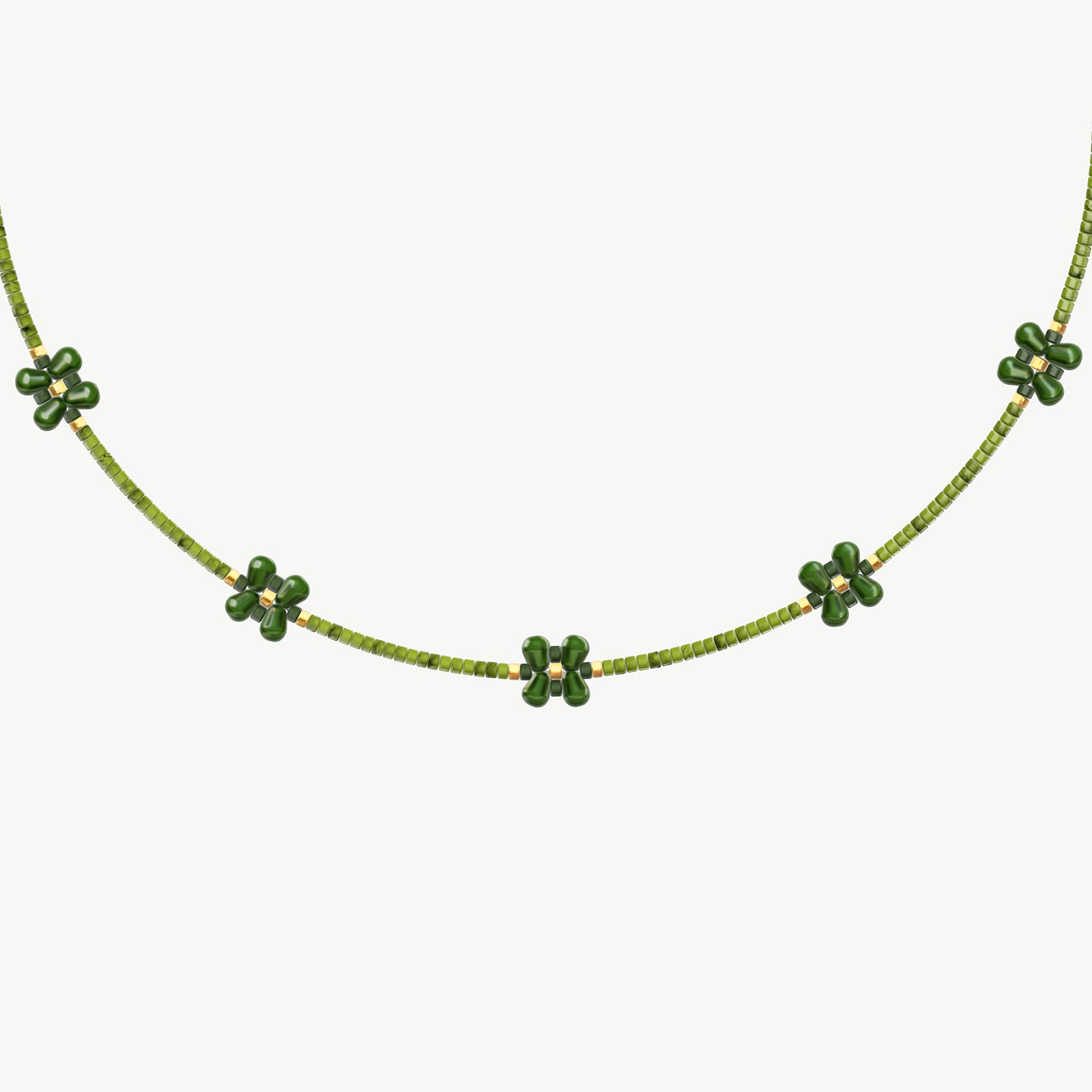 Questa collana con quadrifogli e dettagli dorati è realizzata a mano in Italia con oltre 400 perle in vetro di alta qualità e chiusura a gancio. In taglia unica da 41 cm estendibile fino a 45 cm.
